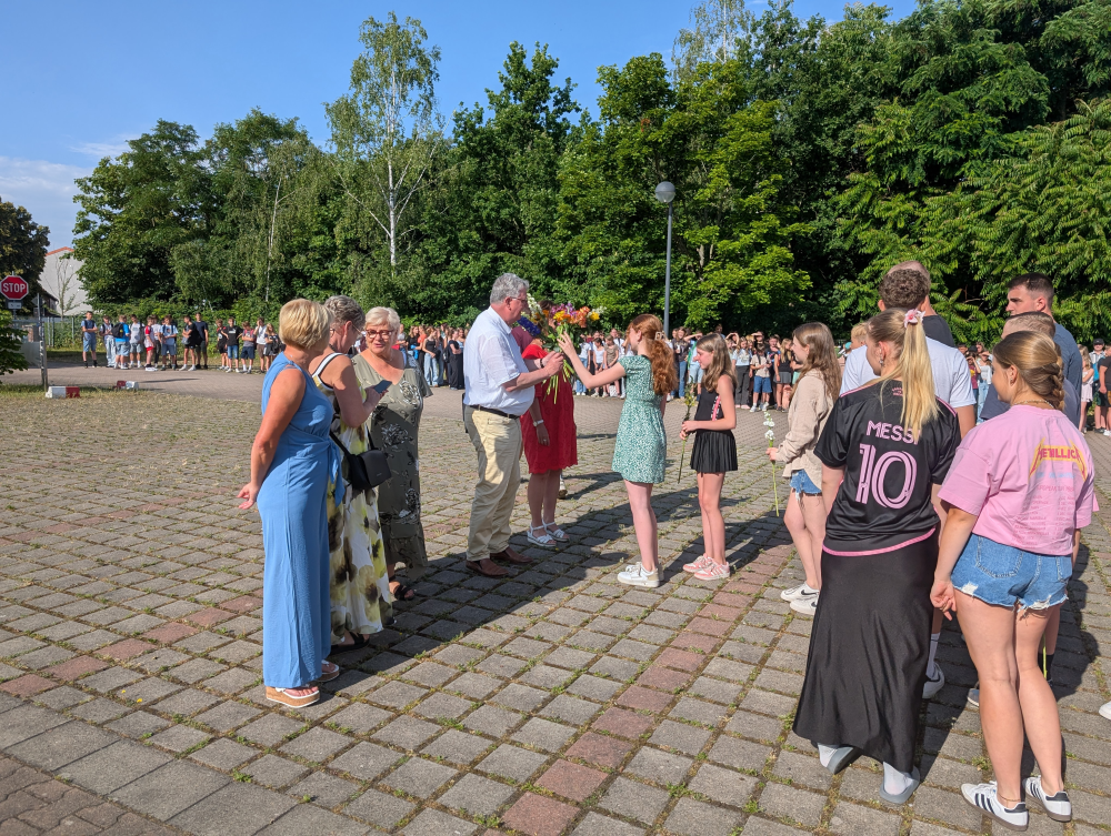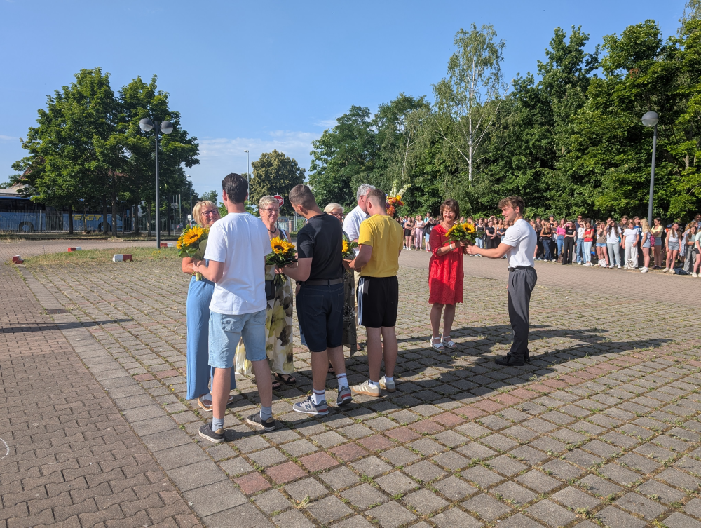 Zum Beginn des diesjährigen Schulfestes versammelten sich alle Schüler und Lehrer des Gymnasiums auf dem Schulhof des Hauses II, um unseren Schulleiter Herrn Liebtrau und vier weitere Kolleginnen in den Ruhezustand zu verabschieden.