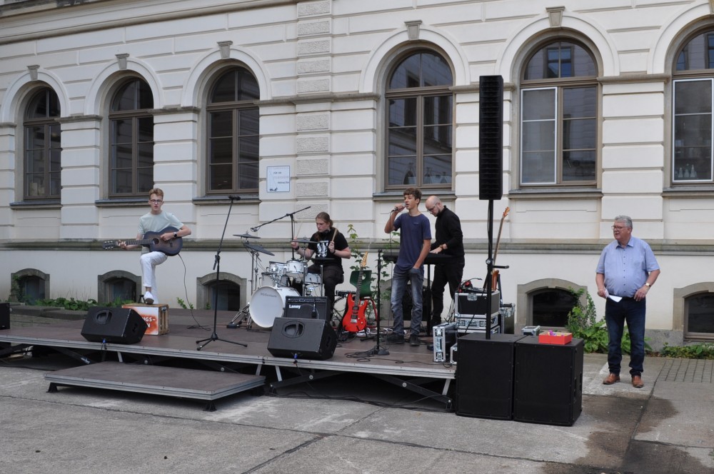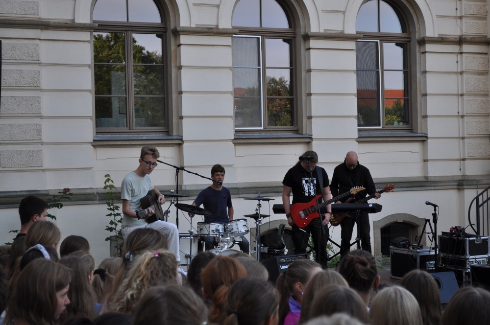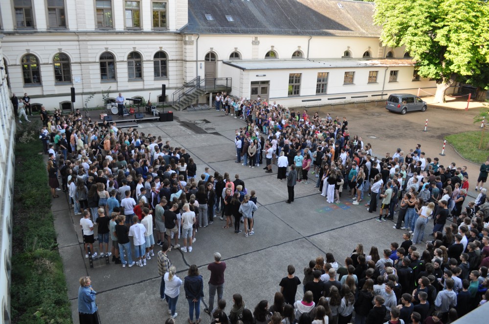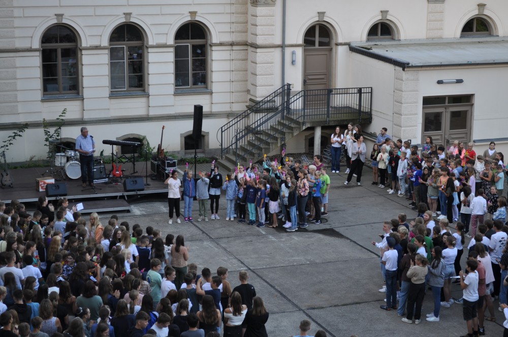 Zum Beginn des diesjährigen Schulfestes versammelten sich alle Schüler und Lehrer des Gymnasiums auf dem Schulhof des Hauses II, um unseren Schulleiter Herrn Liebtrau und vier weitere Kolleginnen in den Ruhezustand zu verabschieden.
