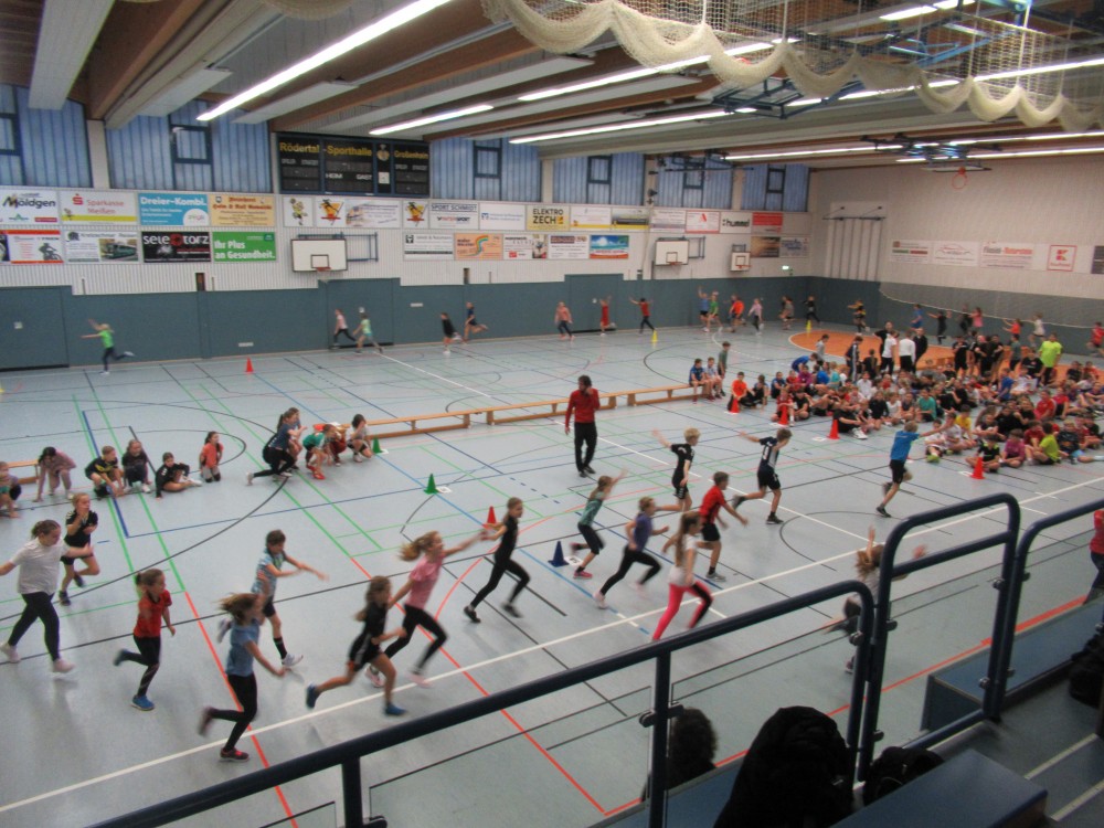 Klassenstufe 6: Auch die sechsten Klassen traten in den beiden Spielsportarten „Ball über die Leine“ und „Zweifelderball“ gegeneinander an. Hier zeigten sich deutliche Leistungsunterschiede: Die Klasse 6d konnte beide Spiele für sich entscheiden, gefolgt von den Klassen 6c, 6b sowie 6a und 6e. Im Staffellauf jedoch gestaltete sich das Feld erneut sehr ausgeglichen. Mit einer Zeit von 2:00,35 Minuten gewann die Klasse 6c den Lauf, dicht gefolgt von 6d (2:01,03 min).