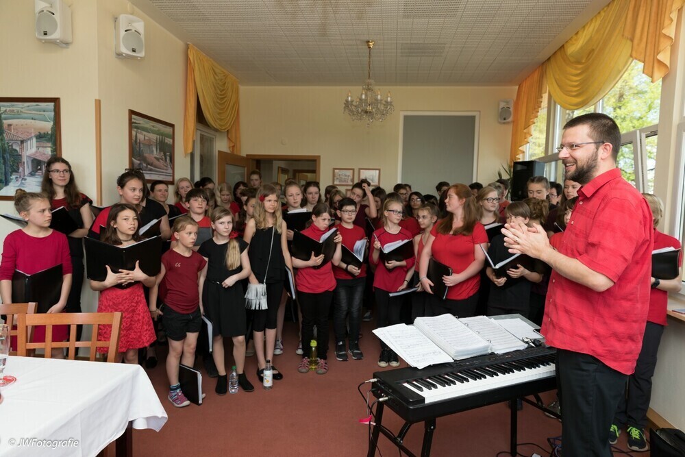 Zusätzlich gab es noch Chormusik von unseren Partnerchören im "Netzwerk Kinderchöre in der Großenhainer Pflege": Zum einen gaben die versammelten Kinderchöre (aus denen hoffentlich die eine oder andere SängerIn zu uns findet) am Kindertag ein Konzert unter dem Motto "Im Kinderland" (insgesamt waren 170 Kinder aus 11 Chören dabei, leider musste das Konzert witterungsbedingt abgebrochen werden). Zum anderen war auch der Eltern-Lehrer-Ehemaligen-Chor präsent. Er gab auf der Weindorf-Bühne am unteren Frauenmarkt sein Programm zum besten, das sich aus Musik der Renaissance-Zeit bis hin zu Songs von Annett Louisann zusammensetzte.