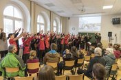 Eigentlich sind wir in Schmiedeberg immer mit viel Gepäck und auf ein Wochenende unterwegs, aber diesmal war es nur die Konzertkluft und die Notenmappe: Das Martin-Luther-King-Haus, in dem wir seit vielen Jahren unsere Probenwochenenden machen, lud uns zur musikalischen Gestaltung der Festveranstaltung zur Feier seines 50-jährigen Bestehens ein. Als kleines Präsent überreichten wir eine Collage mit Eindrücken von unseren verschiedenen Aufenthalten in den letzten Jahren.