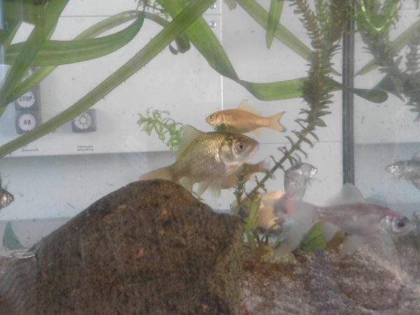 Im Biologiezimmer des Hauptgebäudes stehen 2 Aquarien und ein Terrarium. In einem Aquarium halten wir Fische und im anderen sind Schildkröten.